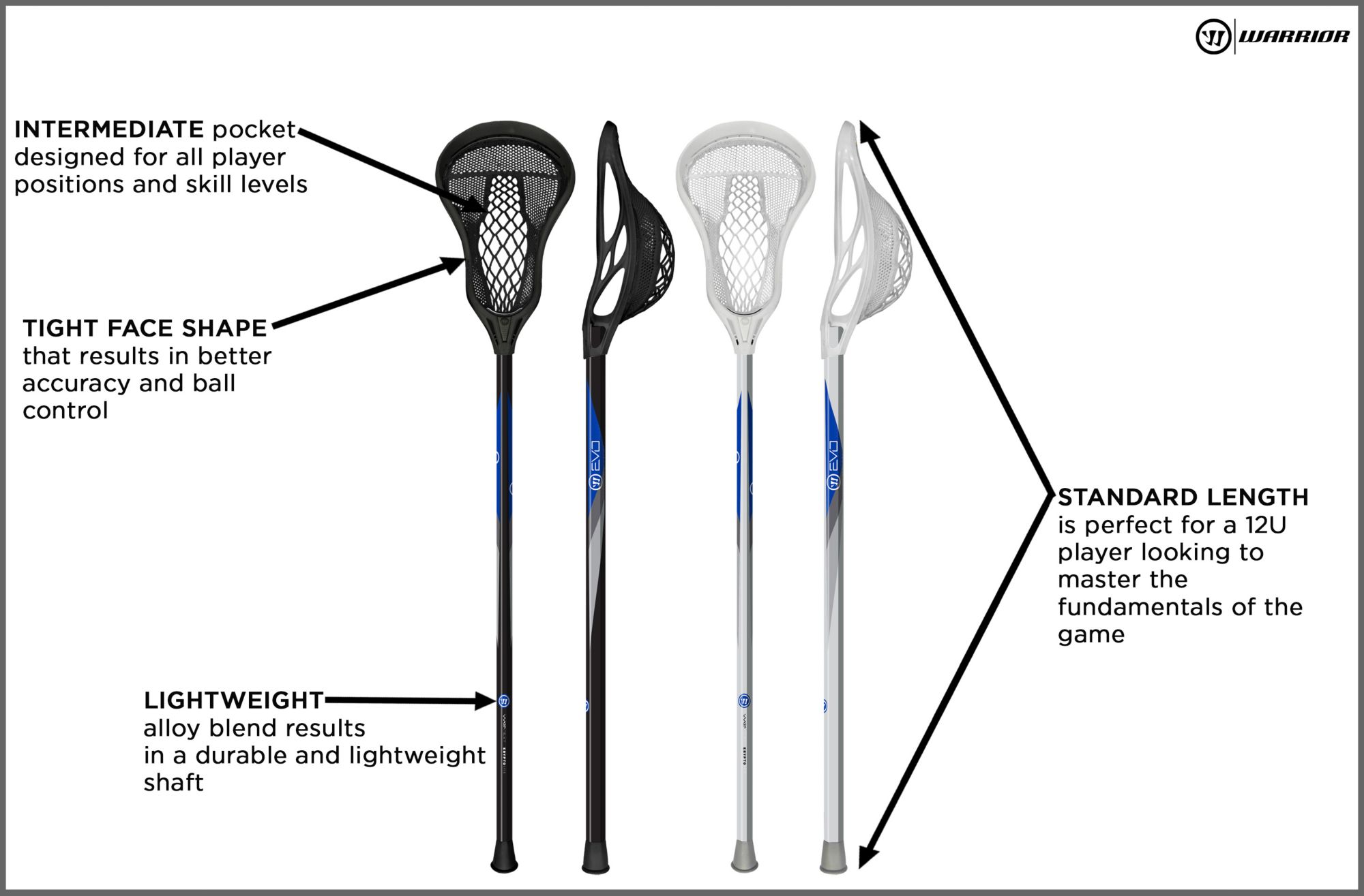 Designed with a revolutionary process that s refined for youth play the warrior evo warp next complete lacrosse stick brings an integrated head and pocket to the field for consistent pass and shot execution in all weather conditions.